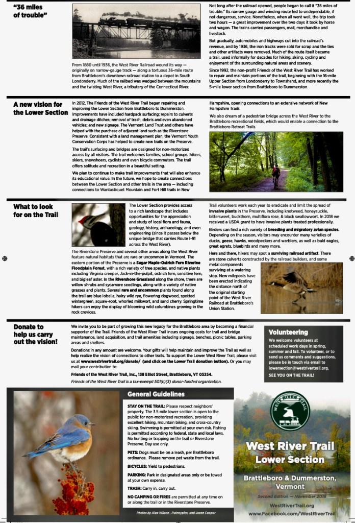 The map of the Lower Section of the West River Trail has lots of trail information on the back. It folds down to pocket size for convenient use on the trail. Pick up your copy at the Marina Restaurant, Brattleboro Chamber of Commerce, River Garden, Brattleboro Bike Shop, Burrows Specialized Sports, West Hill Shop, Guilford Country Store, Route 91 Welcome Center, local hotels, and other locations. Many thanks to C&S Wholesale Grocers Print Shop for donating the printing of the map, and to Jeff Nugent