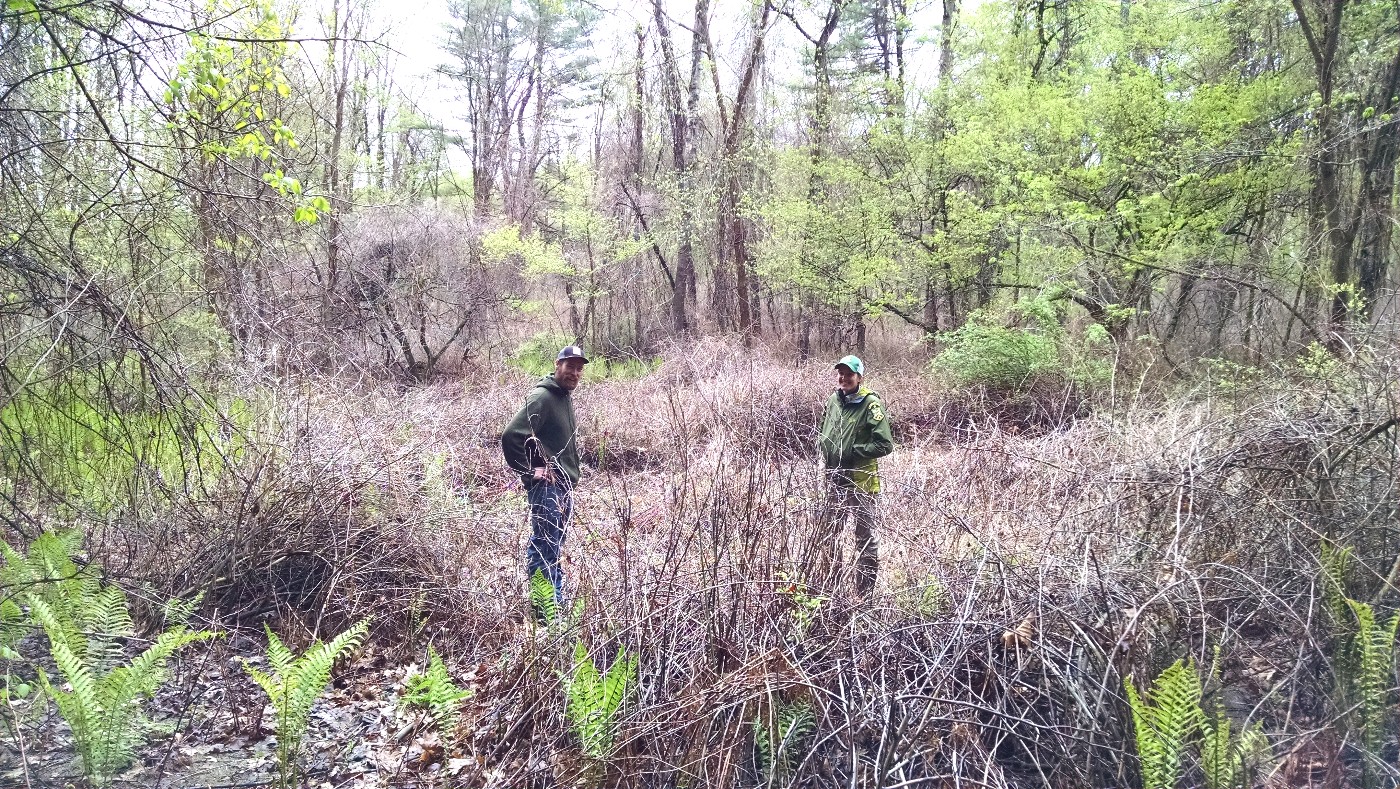 Dan Healey of Long View Forest and Jackie Comeau of Vt Fish & Wildlife survey invasive treatment results on the Riverstone Preserve.