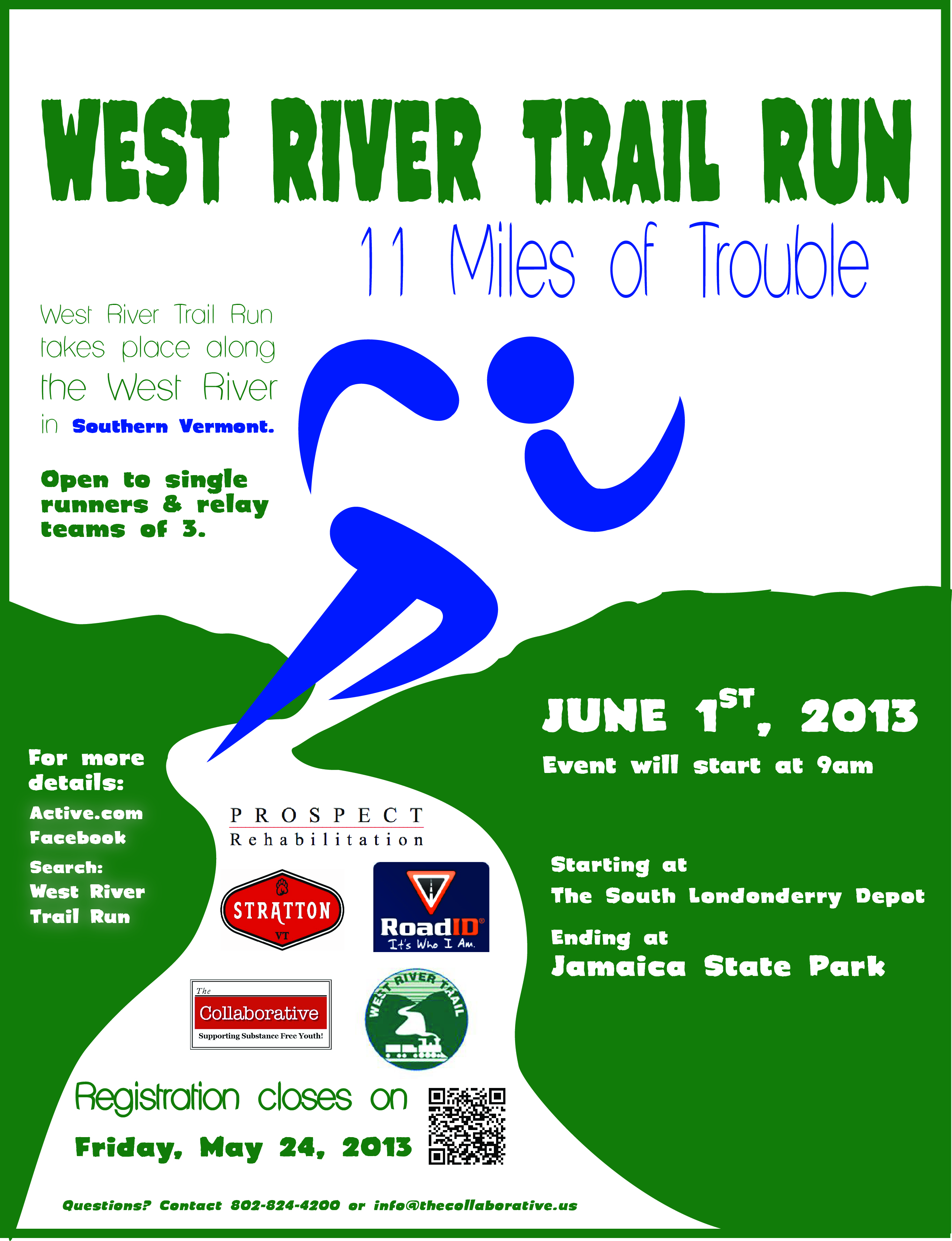 Calling all runners and race volunteers!! Please join us for the annual West River Trail Run on Saturday, June 1st! Please contact us for more information about the event or if you are interested in helping out! Hurry! Registration is limited and closes this Friday, May 24, 2013. Email us at info@thecollaborative.us or call us at 802.824.4200. See poster for more details and contact information.